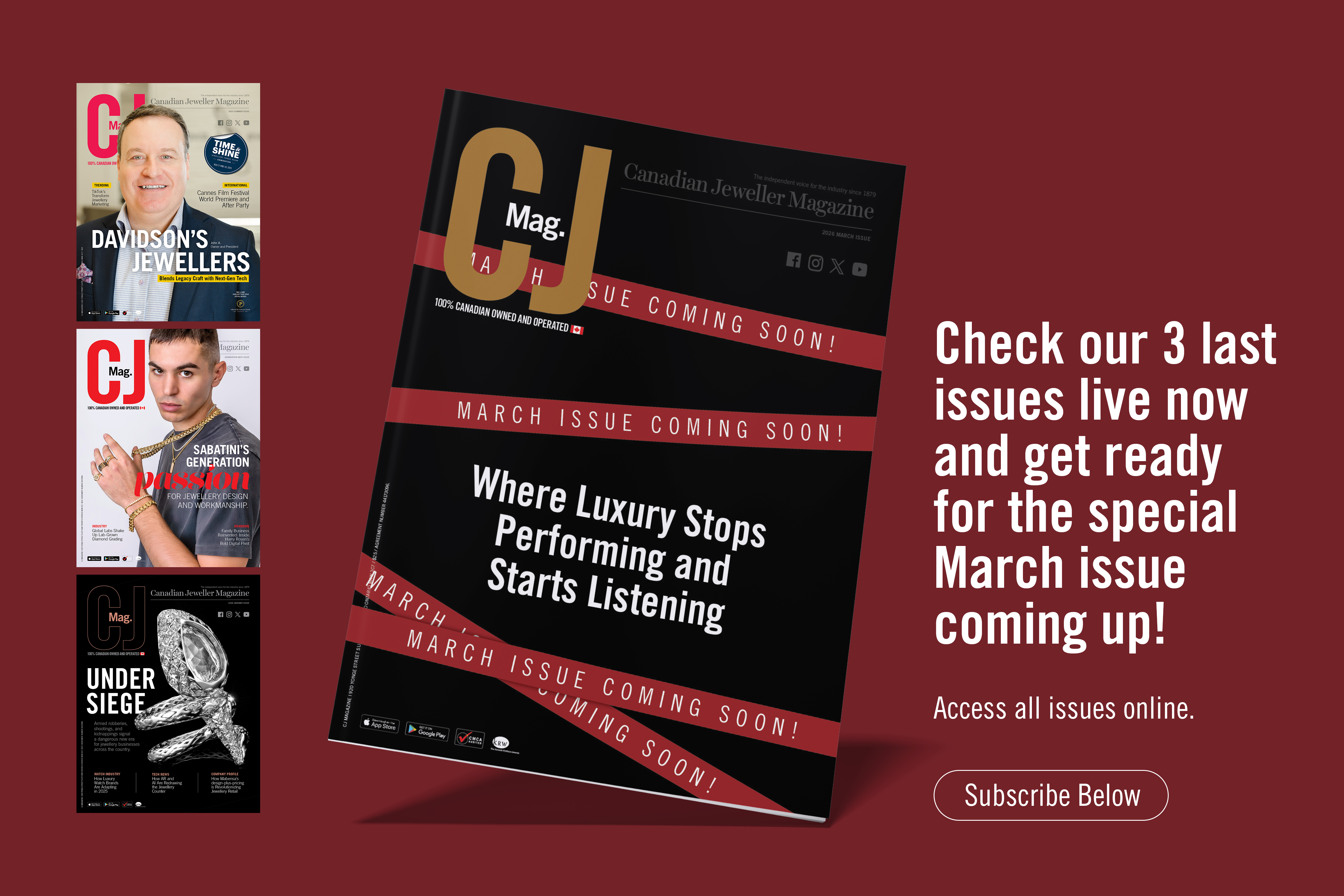 It takes an unrelenting effort to keep a brand fresh and relevant to Canada’s jewellery retailers, some of whom have been reading Canadian Jeweller Magazine for generations. Our attention to detail has made us a leader in the technological advancement of our trade. We have made a continuous investment to create the recognition, credibility, and trust that define our brand. As a result of this, Canadian Jeweller Magazine is in every jeweller’s DNA. Simply put, there is no substitute for Canadian Jeweller Magazine.